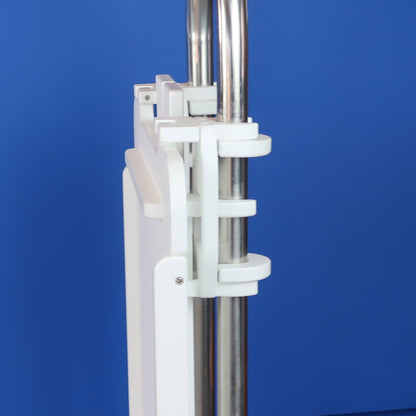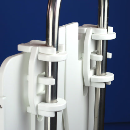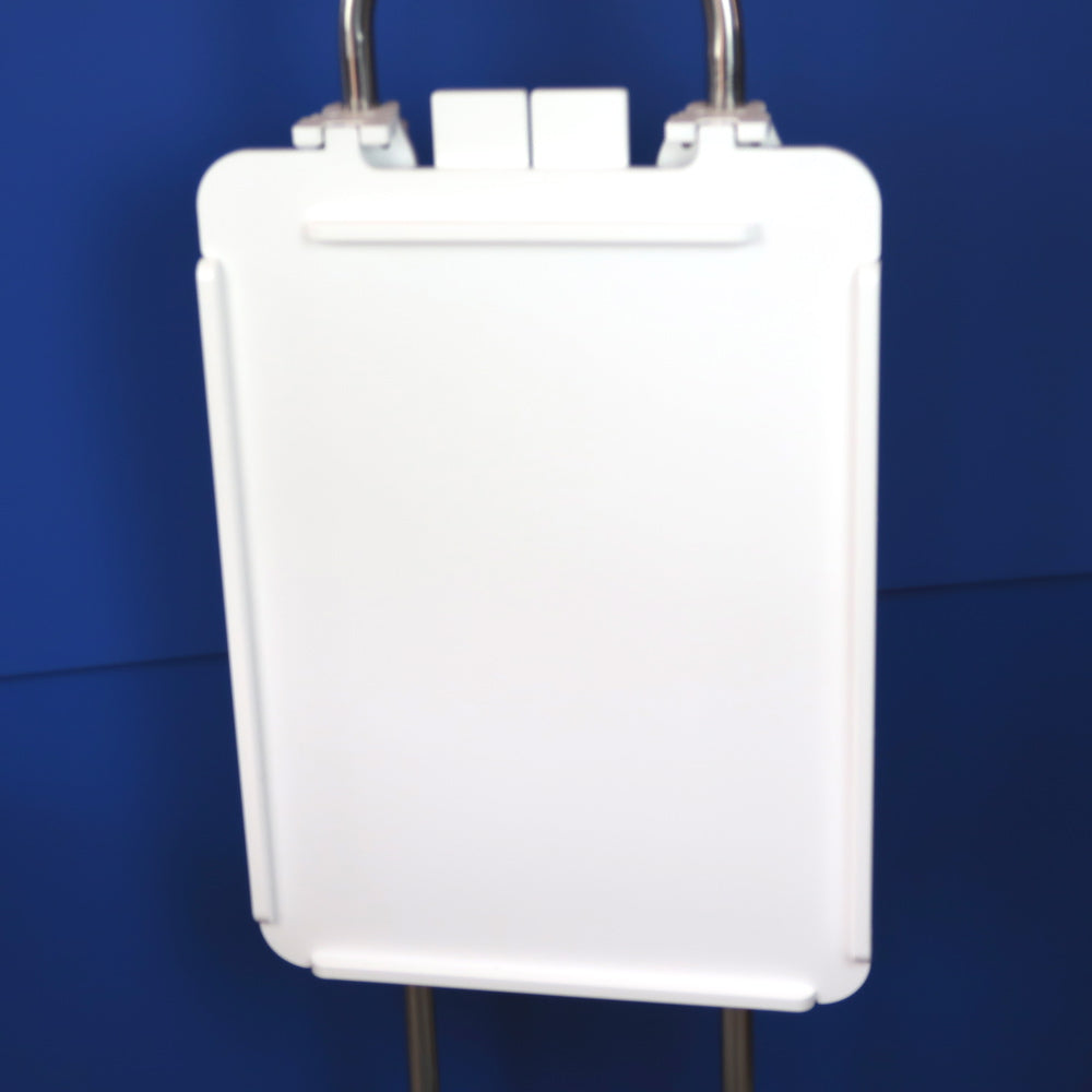 • Snaps and clamps onto pedestal guard. The table is self-supporting and folds and snaps in the closed position.