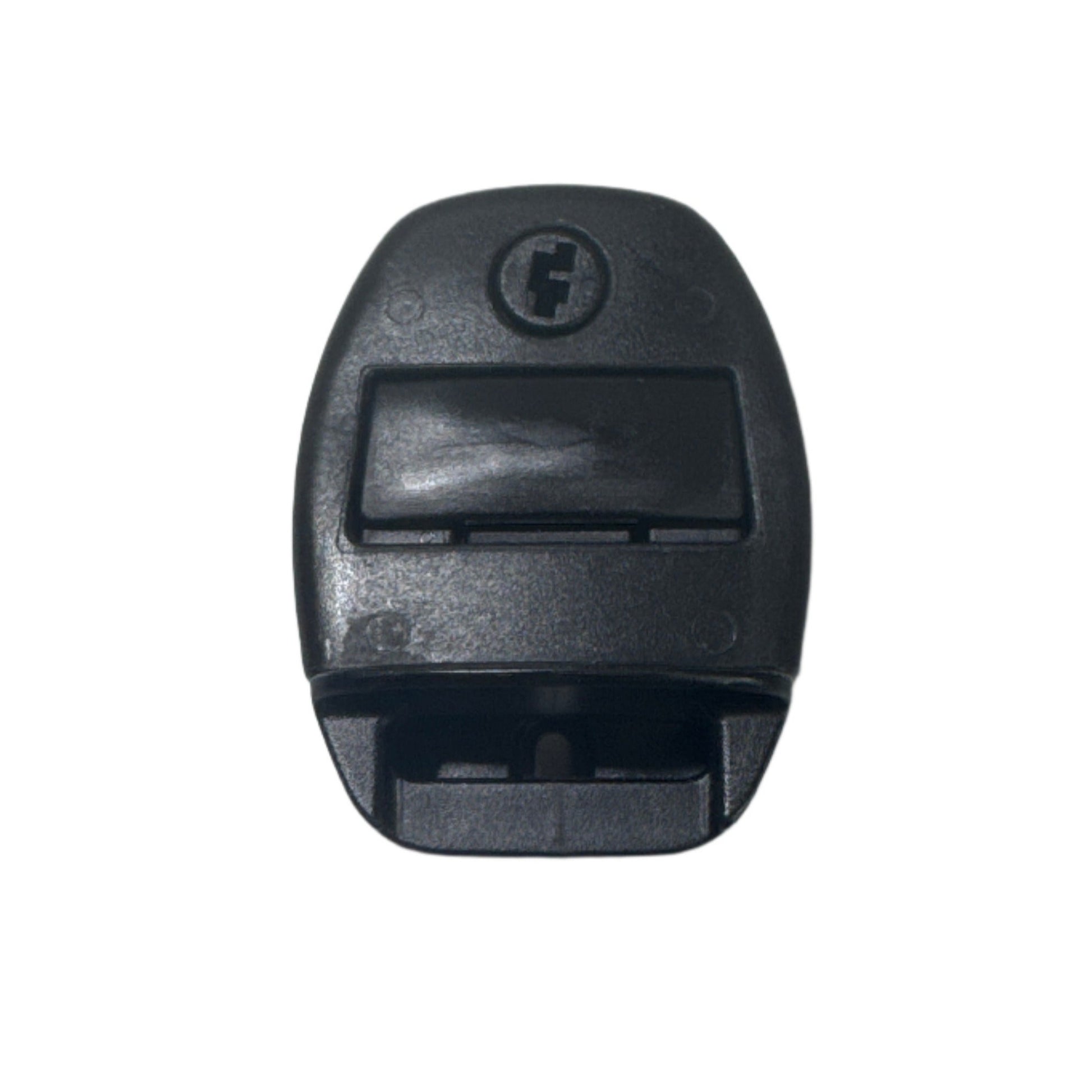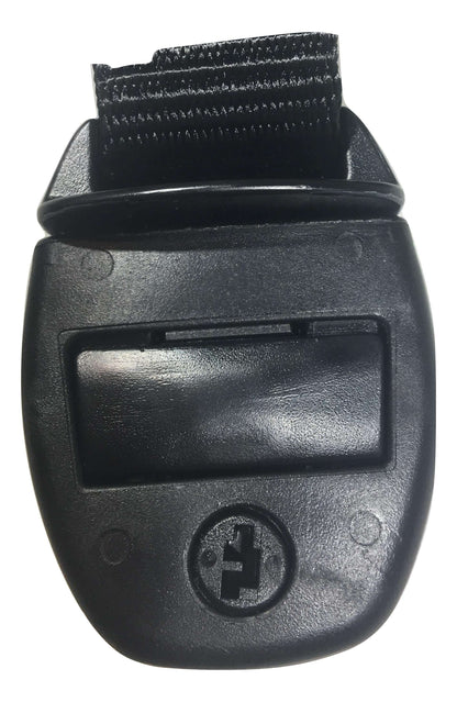 This two-part buckle, featuring a latch that securely locks into its body, is a standard in the spa and hot tub industry. The buckle’s body attaches to surfaces using a #4 Screw, while the latch is designed to hold 1" webbing. The locking mechanism operates by pressing the center release button, ensuring reliable fastening and easy release.
