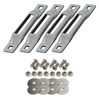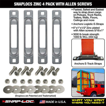 SNAPLOCS are the Fastest, Safest and Easiest way to strap down cargo Where You Want It and Where You Need It on Pickups, Trailers, Truck Racks, Walls, Ceilings, Floors and more! Stop wasting money on wimpy tangled hook straps. SNAPLOCS E-Track Singles give you the positive locking connection of professional-grade logistic E-Straps. Stainless Steel SNAPLOCS fit almost everywhere (5-3/4"x1"x1/2") and have an enormous 3000 lb break strength and 1000 lb working load with the highest level of weather-resistant finish. Pack includes 4 SNAPLOCS, 8 Allen Screws (5/16-18"x1"), 8 Washers and 8 Nylock Nuts. Snap-Loc also offers a variety of System Accessories, Straps and other Fastener Sets for almost every type of application. Best of all, SNAPLOCS are Made in the USA for that Ultimate Cargo Control!