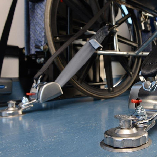 Complete Q'Straint wheelchair securement kit. Includes four QRT deluxe retractors to attach to front and back of wheelchair. Includes Slide-N-Click floor anchorages. Combo shoulder/lap belt is attached to L-Track, and triangle fittings attach to stud on rear retractors. Retractable height adjuster allows for easily changing height of shoulder belt depending on user.